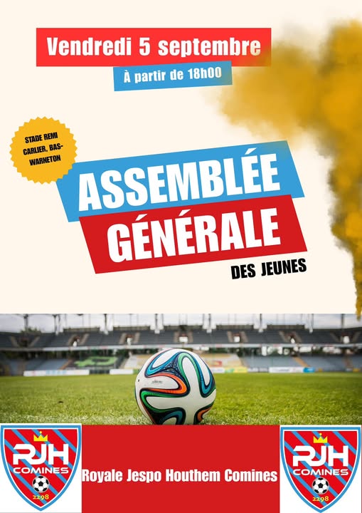 Assemblée Générale des jeunes 5 septembre 2025Annonces , Jeunes , News Grande nouvelle pour toute la famille RJH Comines ! Vendredi 5 septembre dès 18h00, on vous attend nombreux au stade Rémi Carlier à Bas-Warneton pour l’Assemblée Générale des jeunes . C’est le moment idéal pour lancer la saison tous ensemble , partager les infos importantes , rencontrer les coachs et montrer notre motivation . Parents, joueurs, supporters… tout le monde est le bienvenu ! On compte sur vous pour faire de cette soirée un vrai temps fort de la saison . Alors, bloquez la date et venez nombreux… parce qu’à la RJH, on avance tous ensemble, sur et en dehors du terrain !