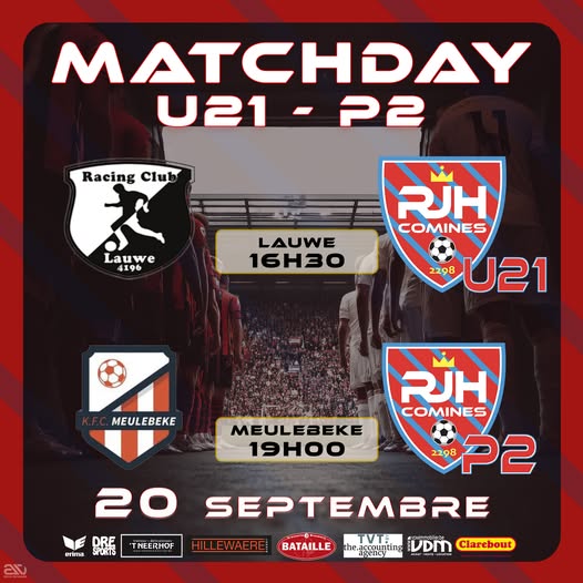 Ensuite, place à nos P2 (RJH Comines-A) qui fileront en soirée du côté de Meulebeke pour un coup d’envoi à 19h00 (Ter Borchtlaan – 8760 Meulebeke, Terrain 1).