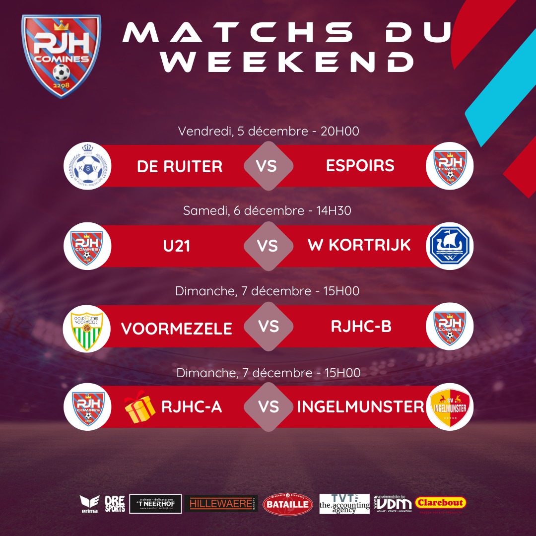 🏠 DIMANCHE 15H00 – P2 RJH Comines vs Ingelmunster. Le 4ème reçoit le 2ème. C’est LE match à ne pas rater. On vous attend nombreux !
