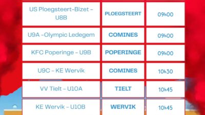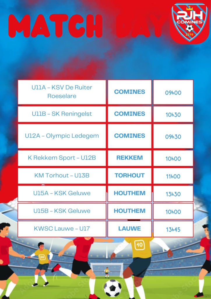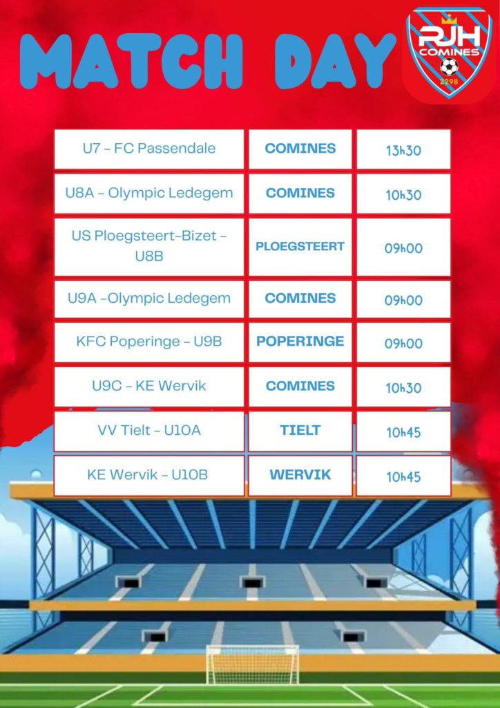 Demain, toutes nos équipes seront sur le terrain. Une belle journée en perspective, pleine d’énergie, de rires et de beaux moments à partager. Les coachs seront au taquet, les joueurs motivés, et les parents pourront savourer leur café en mode supporters dévoués. Voici le programme :