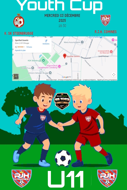 Jour de coupe pour nos U11 !!! 3 décembre 2025Annonces , Jeunes , News Ce mercredi, nos U11 iront user leurs crampons du côté de Steenbrugge en 16ème de finale de la Youth Cup 2025-2026. Venez nombreux les encourager et les soutenir !!!! En avant les petits guerriers !!!!