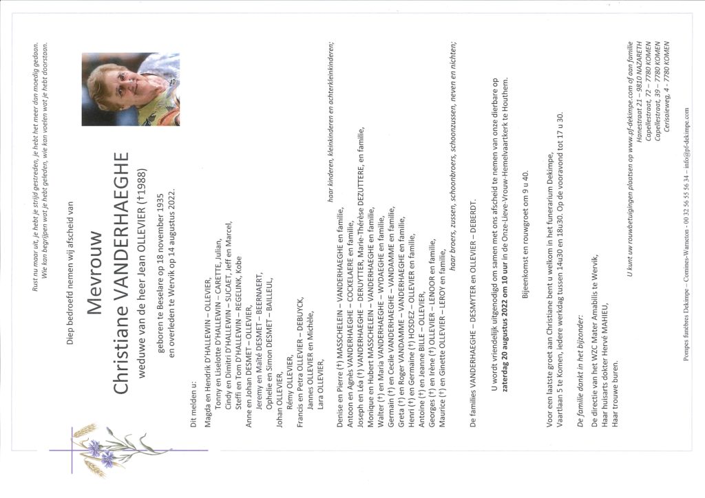 La maman de Johan Ollevier : « Christiane Vanderhaeghe » vient de nous quitter