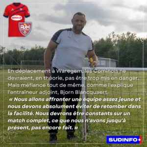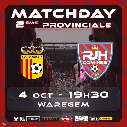 MATCHDAY P2 – RJH Comines sur le terrain synthétique de Waregem. 4 octobre 2025Annonces , Groupe Séniors , News Après une soirée de vendredi bien chargée : U21 victorieux à Wervik (0-5 ) Les Espoirs battus par Staden (1-3) C’est au tour de nos P2 de monter sur scène ce samedi soir RJH Comines-A (5e au classement, 10 points dans la besace) en déplacement chez le KRC Waregem-B (9e avec 6 points) Mirakelstraat, 77 – Mirakelstadion, 8790 Waregem Coup d’envoi : 19h30 Ce déplacement sent la poudre , nos gars vont déminer le terrain !