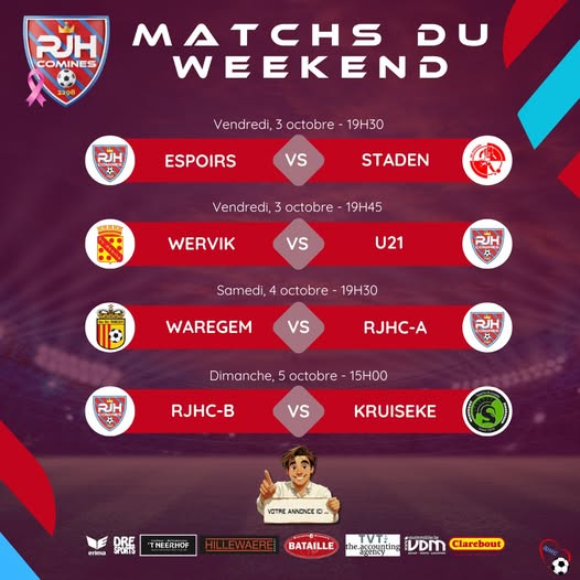 Un nouveau weekend s’annonce pour nos équipes RJH Comines. Entre déplacements et matchs à domicile, chaque rencontre sera importante pour la suite du championnat. Venez nombreux encourager nos couleurs !