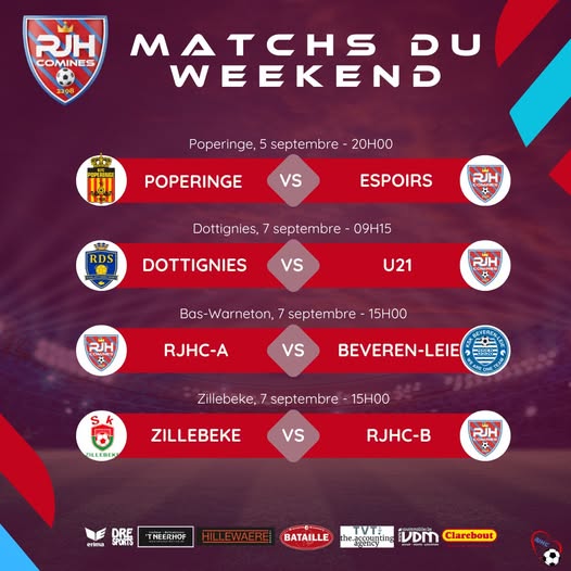 Programme du week-end 3 septembre 2025Groupe Séniors , News Après les résultats du week-end dernier, il va falloir faire des choix… L’agenda de chaque supporter risque d’être bien rempli ! Une véritable réunion de famille s’impose pour organiser tout ça et optimiser vos déplacements. Qui va où ? Avec qui ? Histoire que chaque équipe puisse compter sur son 12e homme. #rjhcomines #comineswarneton #comines #football