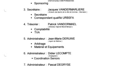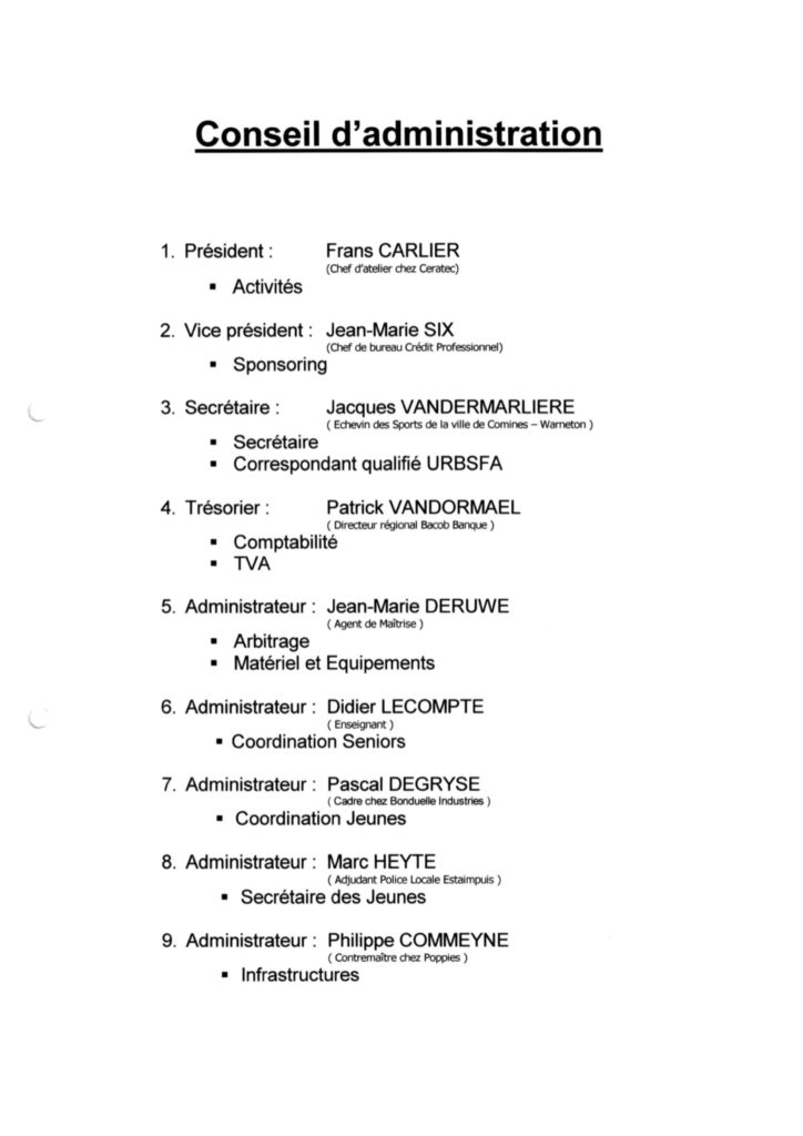 Voici le Conseil d’administration mis en place après la fusion de la Royale Union Cominoise avec la Jespo Bas-Warneton devenue l’asbl ROYALE JESPO COMINES-WARNETON sous le matricule « 2298 » pour démarrer la saison 2002/2003.