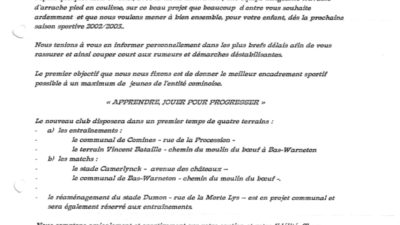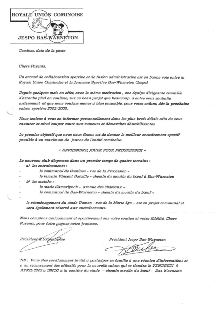 Ce n’était pas un « poisson d’avril », le courrier adressé et signé, Frans Carlier et Jean-Marie Six en avril 2002, aux parents des joueurs de foot. Lisez plutôt :