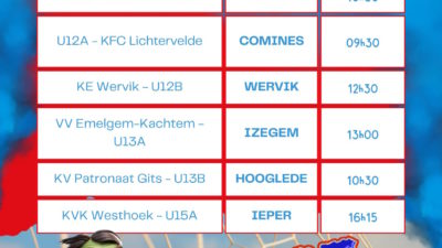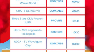 Les U11A joueront à Geluwe, les U11B à Comines, les U12A recevront Lichtervelde, et les U12B affronteront Wervik à l’extérieur.