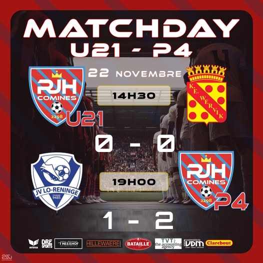 CARTONS JAUNES : 28′ Dodre (RJH Comines), 52′ Vanhoutte (JV Lo-Reninge ), 78′ Hajali (RJH Comines), 80′ Gruwez (JV Lo-Reninge ), 95′ Debiche (RJH Comines).